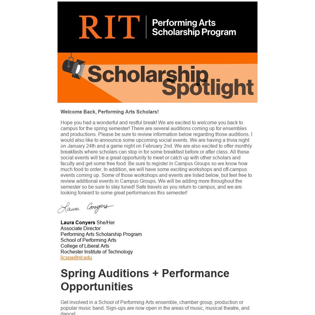 Hope you had a wonderful and restful break! We are excited to welcome you back to campus for the spring semester! There are several auditions coming up for ensembles and productions. Please be sure to review information below regarding those auditions. I would also like to announce some upcoming social events. We are having a trivia night on January 24th and a game night on February 2nd. We are also excited to offer monthly breakfasts where scholars can stop in for some breakfast before or after class. All these social events will be a great opportunity to meet or catch up with other scholars and faculty and get some free food. Be sure to register in Campus Groups so we know how much food to order. In addition, we will have some exciting workshops and off-campus events coming up. Some of those workshops and events are listed below, but feel free to review additional events in Campus Groups. We will be adding more throughout the semester so be sure to stay tuned! Safe travels as you return to campus, and we are looking forward to some great performances this semester!