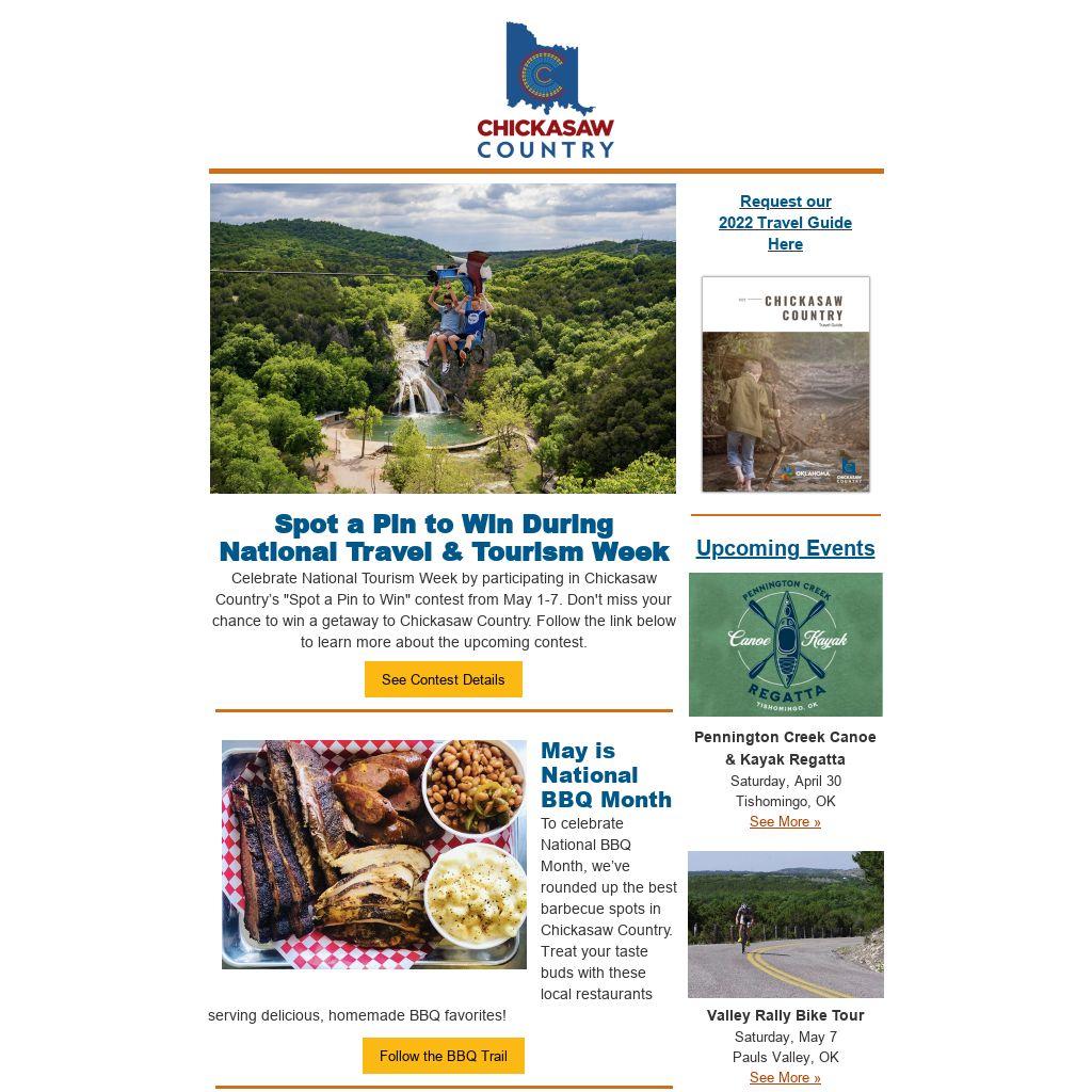 Celebrate National Tourism Week by participating in Chickasaw Country’s "Spot a Pin to Win" contest from May 1-7. Don't miss your chance to win a getaway to Chickasaw Country. Follow the link below to learn more about the upcoming contest.