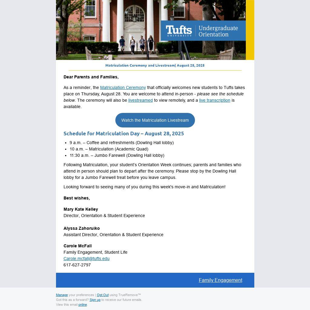 As a reminder, the Matriculation Ceremony that officially welcomes new students to Tufts takes place on Thursday, August 28. You are welcome to attend in-person - please see the schedule below. The ceremony will also be livestreamed to view remotely, and a live transcription is available.