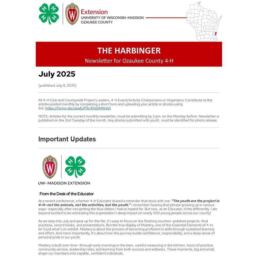 Mr. & Miss Ozaukee 4-H 2025-2026 Application Deadline: July 12th. Older youth are invite to apply and be an ambassador for Ozaukee County 4-H throughout the next 4-H year! A Candidate letter with information explaining dates, times and duties as well as an Application form can be found on the Ozaukee County 4-H website. Go to the 4-H Forms/Resources page, under 'Countywide Activities' to download the letter and form. All forms are due July 12th to Dorothy Parchim at rondorpar@yahoo.com.