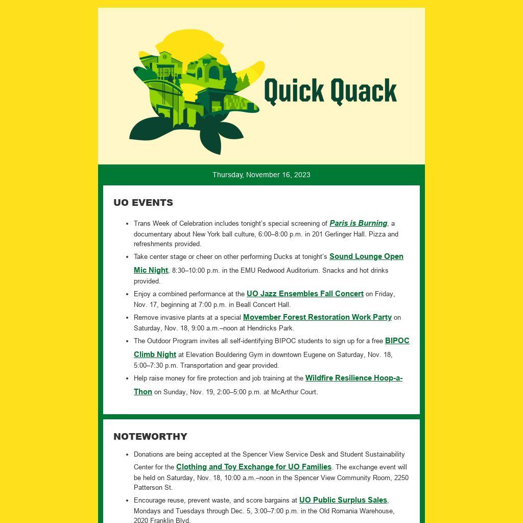 Take center stage or cheer on other performing Ducks at tonight’s Sound Lounge Open Mic Night, 8:30–10:00 p.m. in the EMU Redwood Auditorium. Snacks and hot drinks provided.