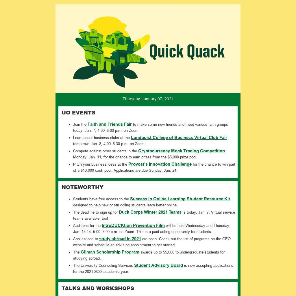 Auditions for the IntroDUCKtion Prevention Film will be held Wednesday and Thursday, Jan. 13-14, 5:00–7:00 p.m. on Zoom. This is a paid acting opportunity for students.