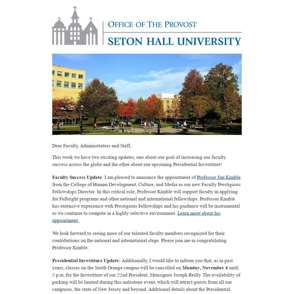 Presidential Investiture Update: Additionally, I would like to inform you that, as in past years, classes on the South Orange campus will be cancelled on Monday, November 4 until 5 p.m. for the Investiture of our 22nd President, Monsignor Joseph Reilly. The availability of parking will be limited during this milestone event, which will attract guests from all our campuses, the state of New Jersey and beyond. Additional details about the Presidential Investiture will be announced soon, and we look forward to seeing you there.