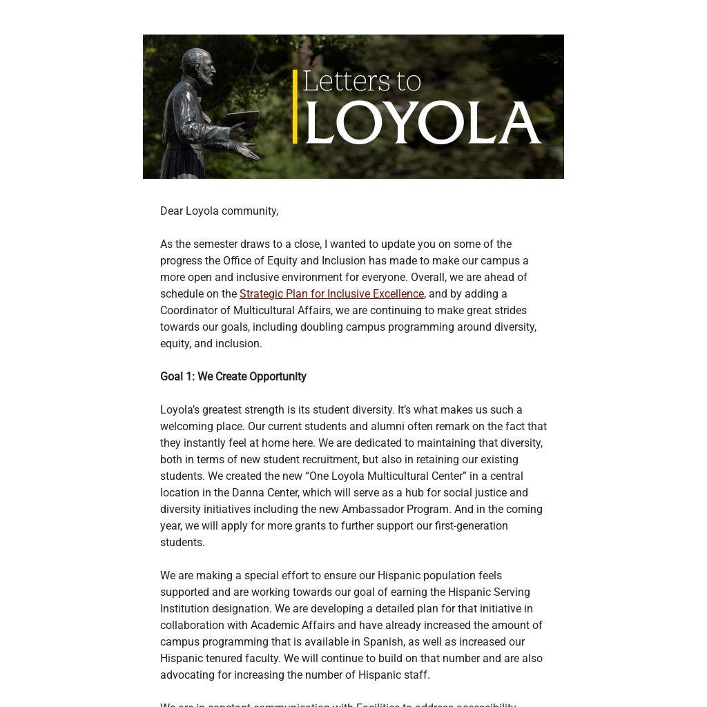This has been mentioned before, but it bears repeating that in our compensation study, Mercer found almost no potential wage disparities due to race. This reflects Loyola’s long-term commitment to equity in the workplace.