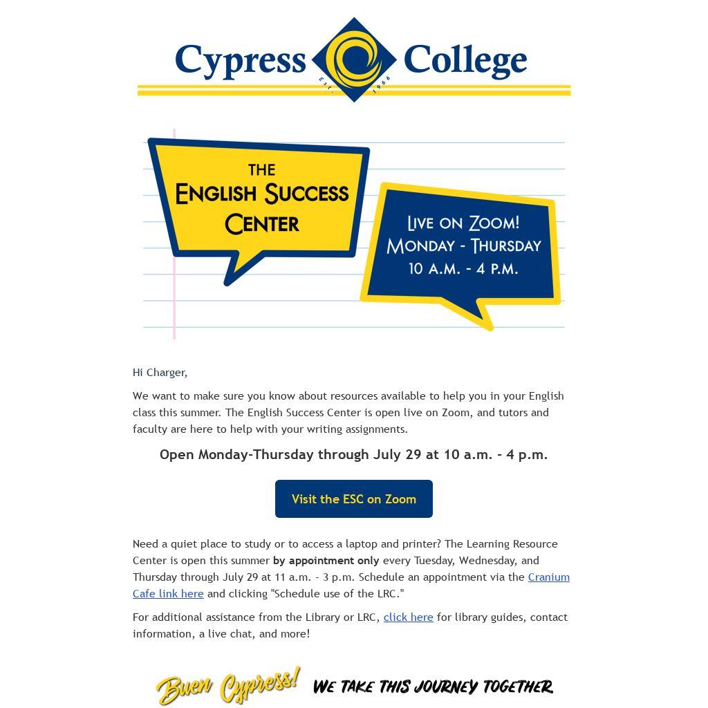 We want to make sure you know about resources available to help you in your English class this summer. The English Success Center is open live on Zoom, and tutors and faculty are here to help with your writing assignments.