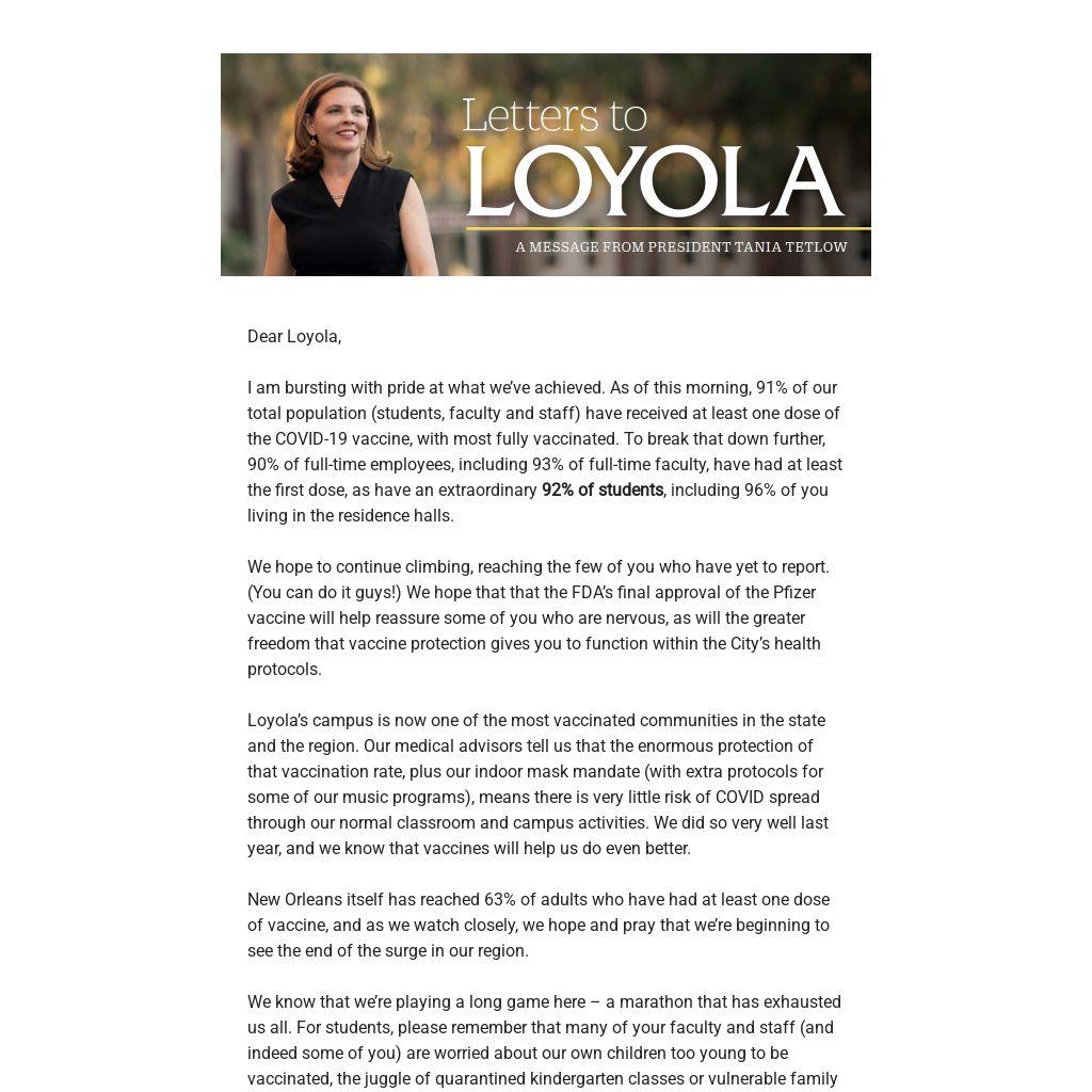 Loyola’s campus is now one of the most vaccinated communities in the state and the region. Our medical advisors tell us that the enormous protection of that vaccination rate, plus our indoor mask mandate (with extra protocols for some of our music programs), means there is very little risk of COVID spread through our normal classroom and campus activities. We did so very well last year, and we know that vaccines will help us do even better.