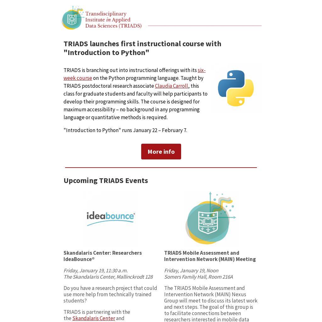 TRIADS is branching out into instructional offerings with its six-week course on the Python programming language. Taught by TRIADS postdoctoral research associate Claudia Carroll, this class for graduate students and faculty will help participants to develop their programming skills. The course is designed for maximum accessibility – no background in any programming language or quantitative methods is required.