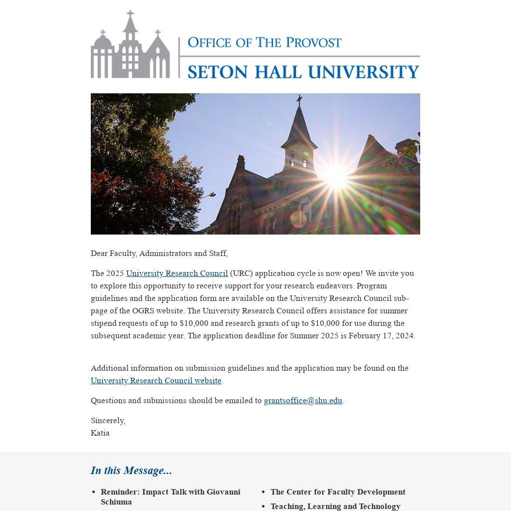The 2025 University Research Council (URC) application cycle is now open! We invite you to explore this opportunity to receive support for your research endeavors. Program guidelines and the application form are available on the University Research Council sub-page of the OGRS website. The University Research Council offers assistance for summer stipend requests of up to $10,000 and research grants of up to $10,000 for use during the subsequent academic year. The application deadline for Summer 2025 is February 17, 2024.