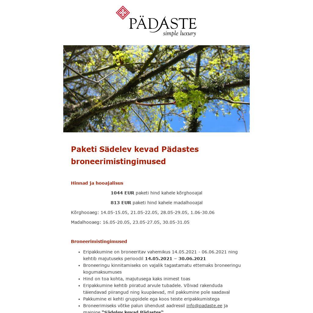 - Broneerimiseks võtke palun ühendust aadressil info@padaste.ee ja mainige “Sädelev kevad Pädastes“