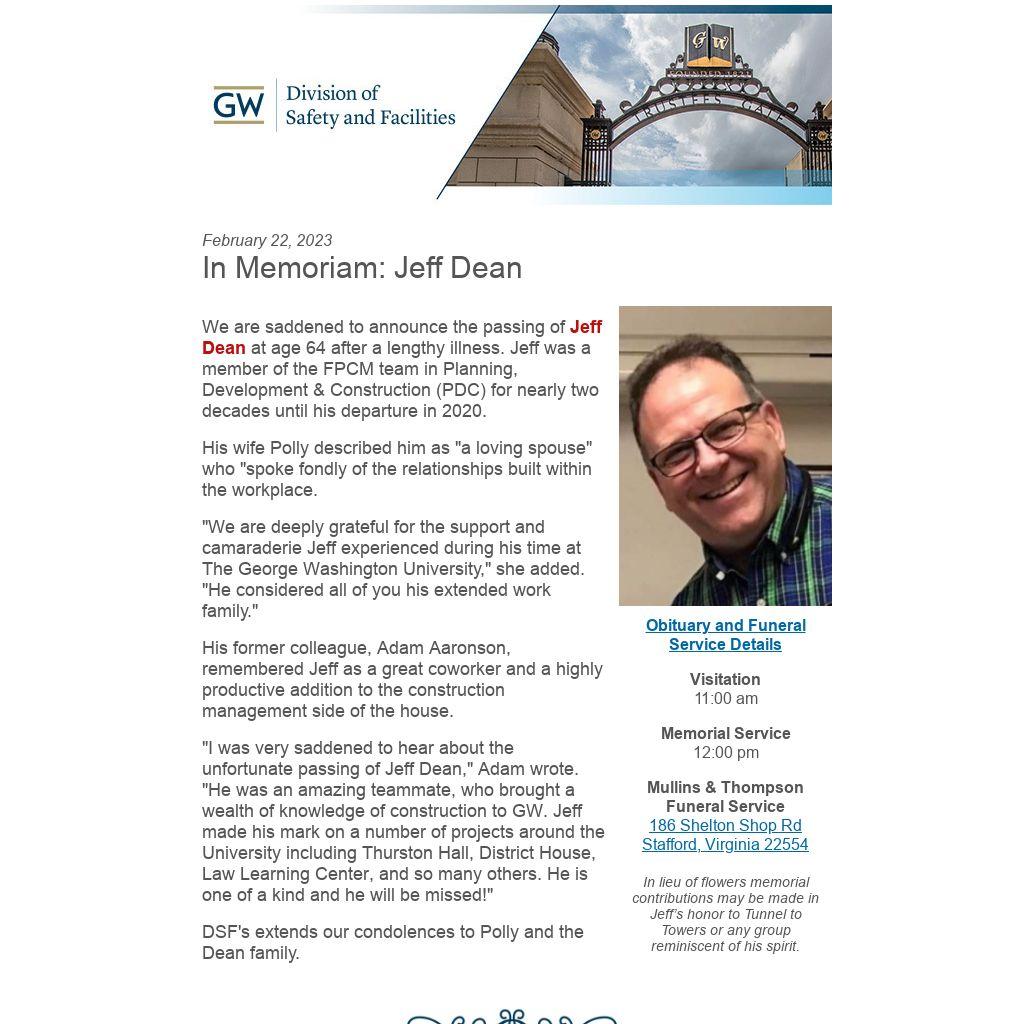 "I was very saddened to hear about the unfortunate passing of Jeff Dean," Adam wrote. "He was an amazing teammate, who brought a wealth of knowledge of construction to GW. Jeff made his mark on a number of projects around the University including Thurston Hall, District House, Law Learning Center, and so many others. He is one of a kind and he will be missed!"