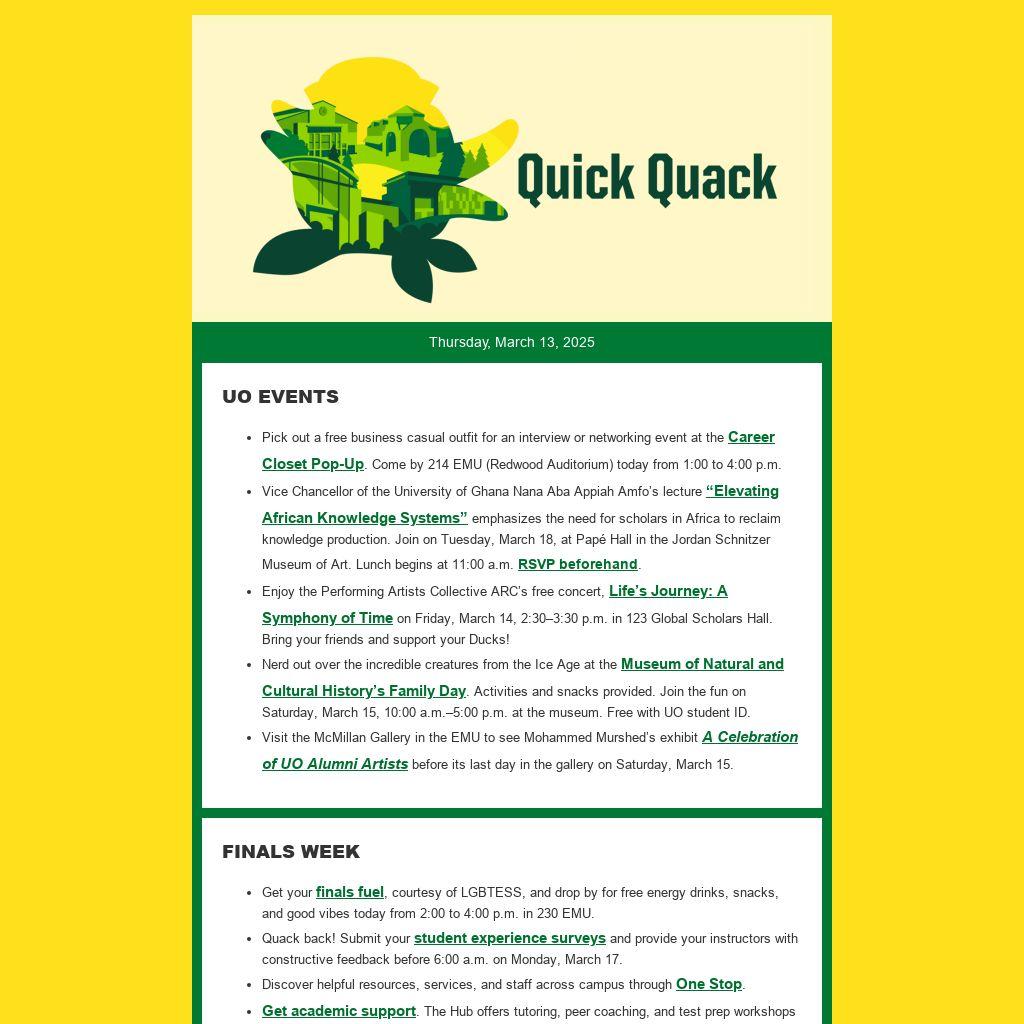 Enjoy the Performing Artists Collective ARC’s free concert,Life’s Journey: A Symphony of Time on Friday, March 14, 2:30–3:30 p.m. in 123 Global Scholars Hall. Bring your friends and support your Ducks!