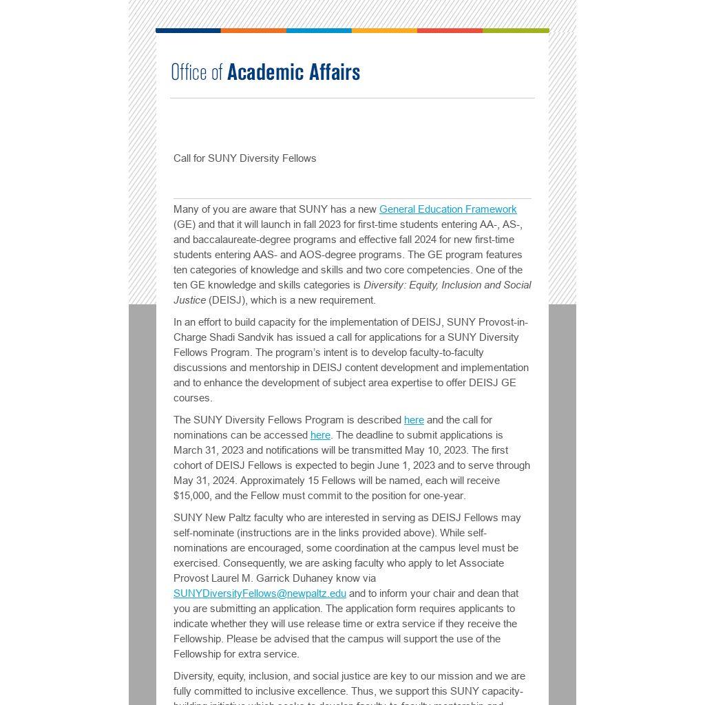 In an effort to build capacity for the implementation of DEISJ, SUNY Provost-in-Charge Shadi Sandvik has issued a call for applications for a SUNY Diversity Fellows Program. The program’s intent is to develop faculty-to-faculty discussions and mentorship in DEISJ content development and implementation and to enhance the development of subject area expertise to offer DEISJ GE courses.