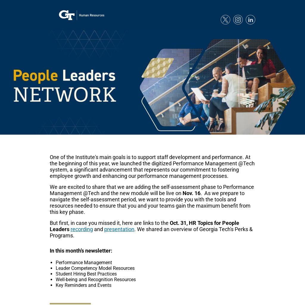 But first, in case you missed it, here are links to the Oct. 31, HR Topics for People Leaders recording and presentation. We shared an overview of Georgia Tech's Perks & Programs.