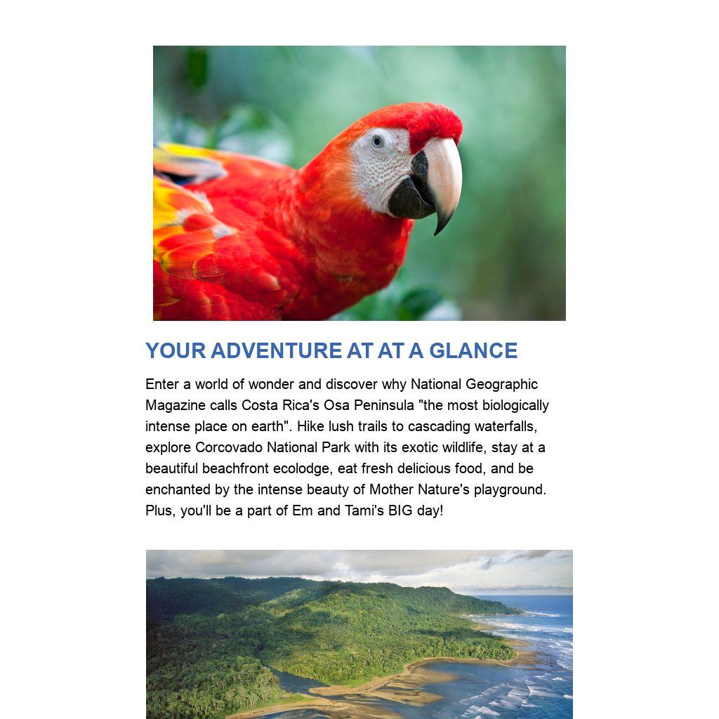 Enter a world of wonder and discover why National Geographic Magazine calls Costa Rica's Osa Peninsula "the most biologically intense place on earth". Hike lush trails to cascading waterfalls, explore Corcovado National Park with its exotic wildlife, stay at a beautiful beachfront ecolodge, eat fresh delicious food, and be enchanted by the intense beauty of Mother Nature's playground. Plus, you'll be a part of Em and Tami's BIG day!