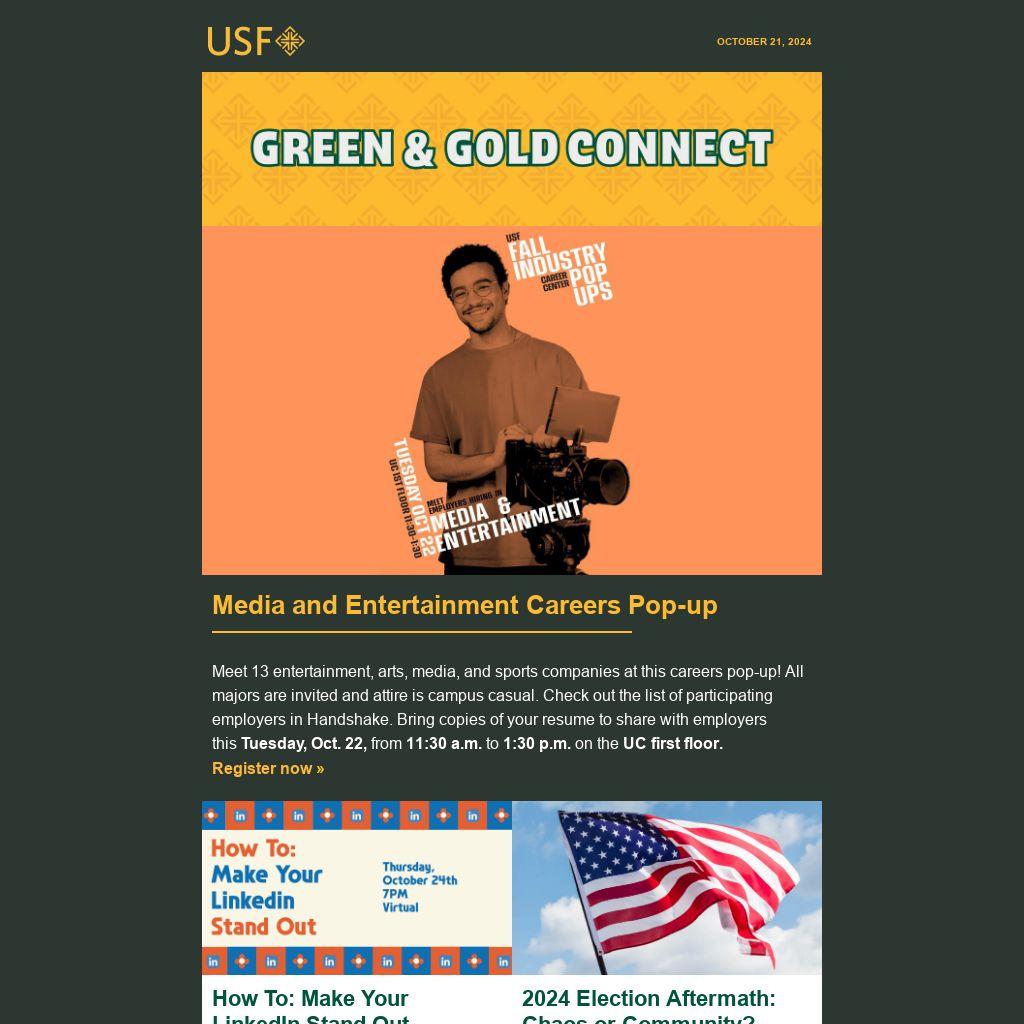 Meet 13 entertainment, arts, media, and sports companies at this careers pop-up! All majors are invited and attire is campus casual. Check out the list of participating employers in Handshake. Bring copies of your resume to share with employers this Tuesday, Oct. 22, from 11:30 a.m. to 1:30 p.m. on the UC first floor.