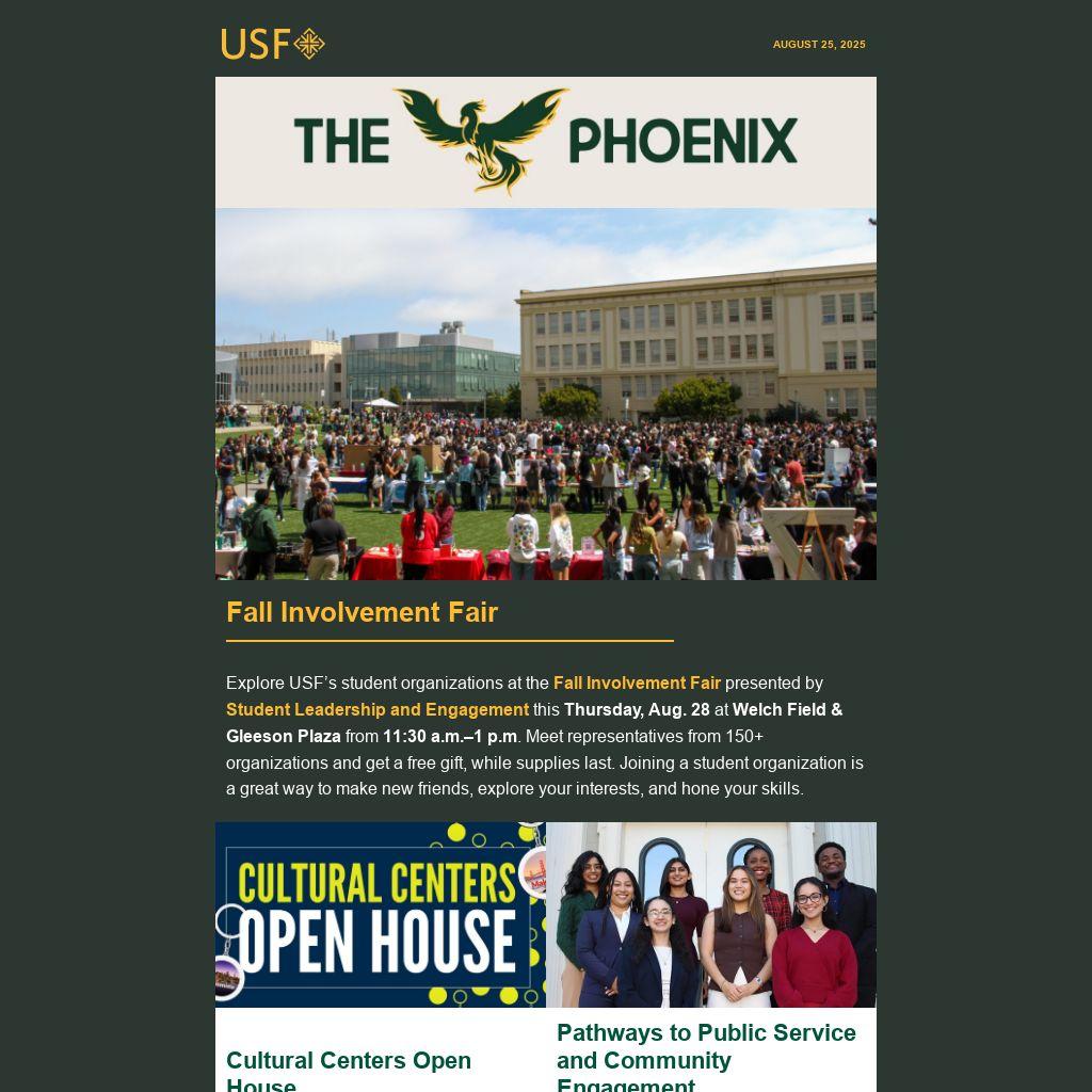 The Phoenix is a weekly e-newsletter sent by Student Leadership and Engagement to help students stay connected and get involved. It features campus events, leadership opportunities, athletic games, workshops, retreats, and more. Why “The Phoenix” title? The Phoenix has long been associated with the history and growth of USF as well as St. Ignatius, who encouraged followers to “go forth and set the world on fire.” Learn more »