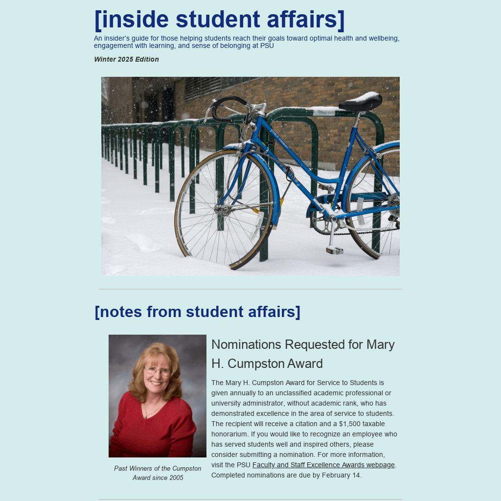 Archived issues of Inside Student Affairs and links to subscribe to other campus newsletters can be found here.