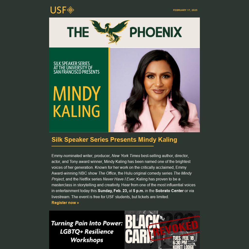 Emmy-nominated writer, producer, New York Times best-selling author, director, actor, and Tony award winner, Mindy Kaling has been named one of the brightest voices of her generation. Known for her work on the critically acclaimed, Emmy Award-winning NBC show The Office, the Hulu original comedy series The Mindy Project, and the Netflix series Never Have I Ever, Kaling has proven to be a masterclass in storytelling and creativity. Hear from one of the most influential voices in entertainment today this Sunday, Feb. 23, at 5 p.m. in the Sobrato Center or via livestream. The event is free for USF students, but tickets are limited.