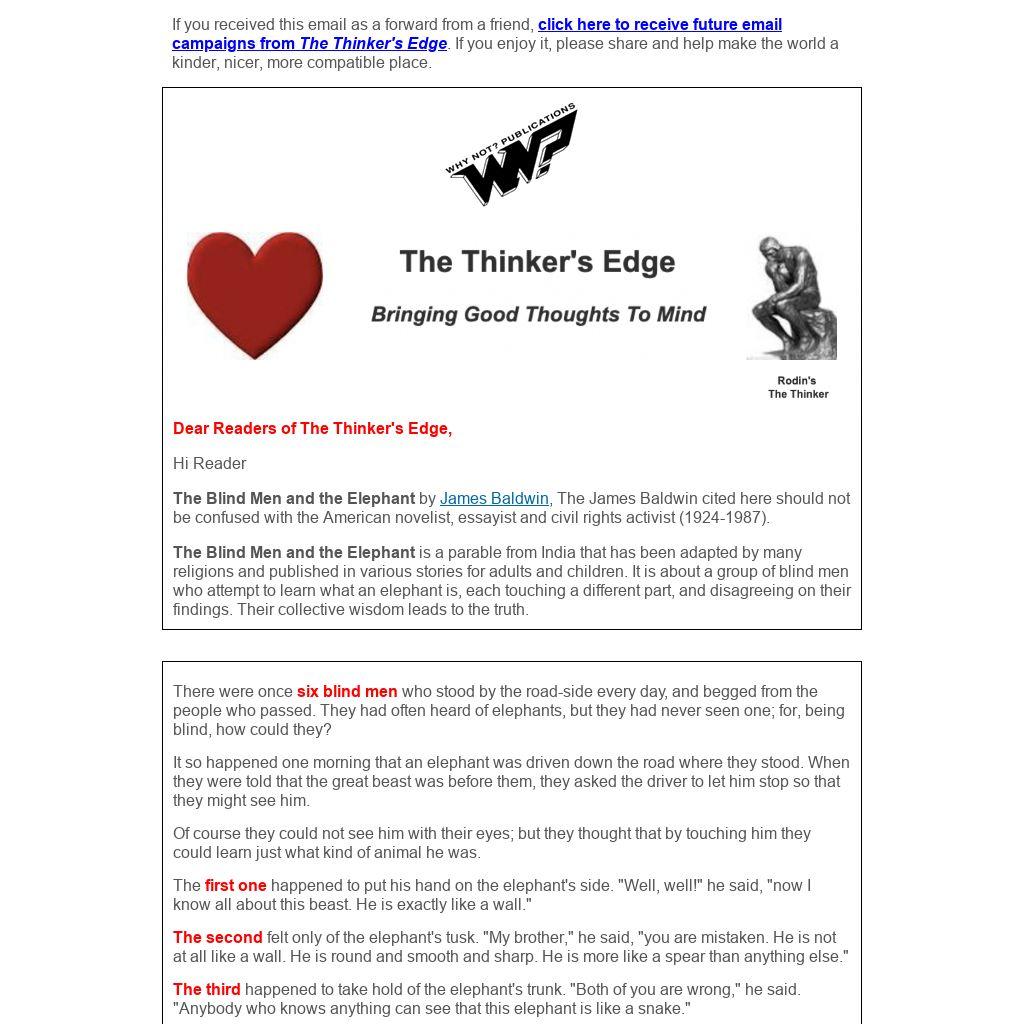 Then the elephant moved on, and the six blind men sat by the roadside all day, and quarreled about him. Each believed that he knew just how the animal looked; and each called the others hard names because they did not agree with him. People who have eyes sometimes act as foolishly.