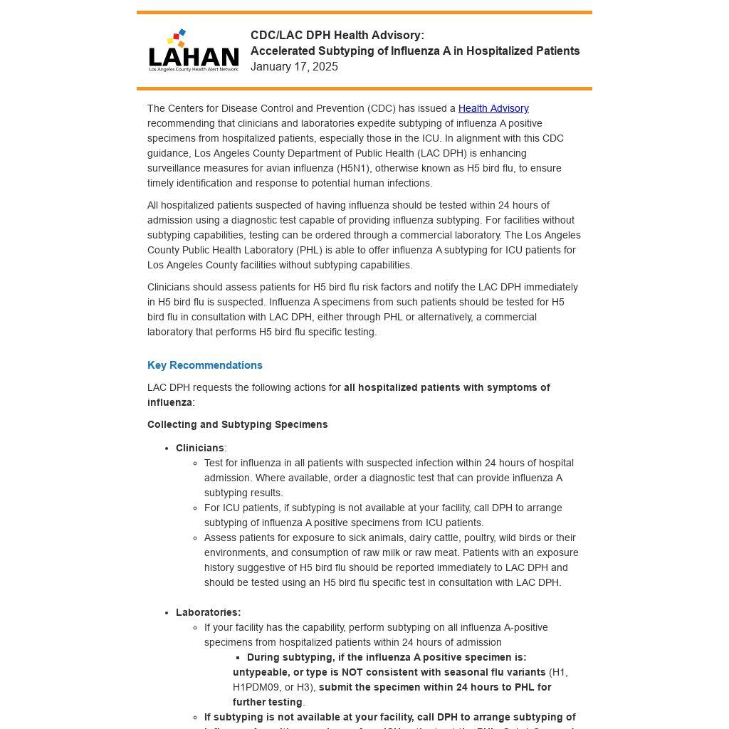 The Centers for Disease Control and Prevention (CDC) has issued a Health Advisory recommending that clinicians and laboratories expedite subtyping of influenza A positive specimens from hospitalized patients, especially those in the ICU. In alignment with this CDC guidance, Los Angeles County Department of Public Health (LAC DPH) is enhancing surveillance measures for avian influenza (H5N1), otherwise known as H5 bird flu, to ensure timely identification and response to potential human infections.
