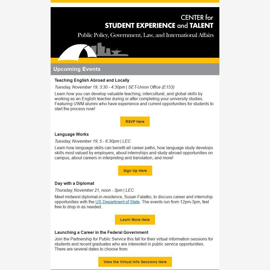 Panthers Connect is a dynamic mentoring and professional development community for UWM alumni, students, faculty, and staff. Join the Public Policy, Government, Law, and International Affairs Career Community Group!