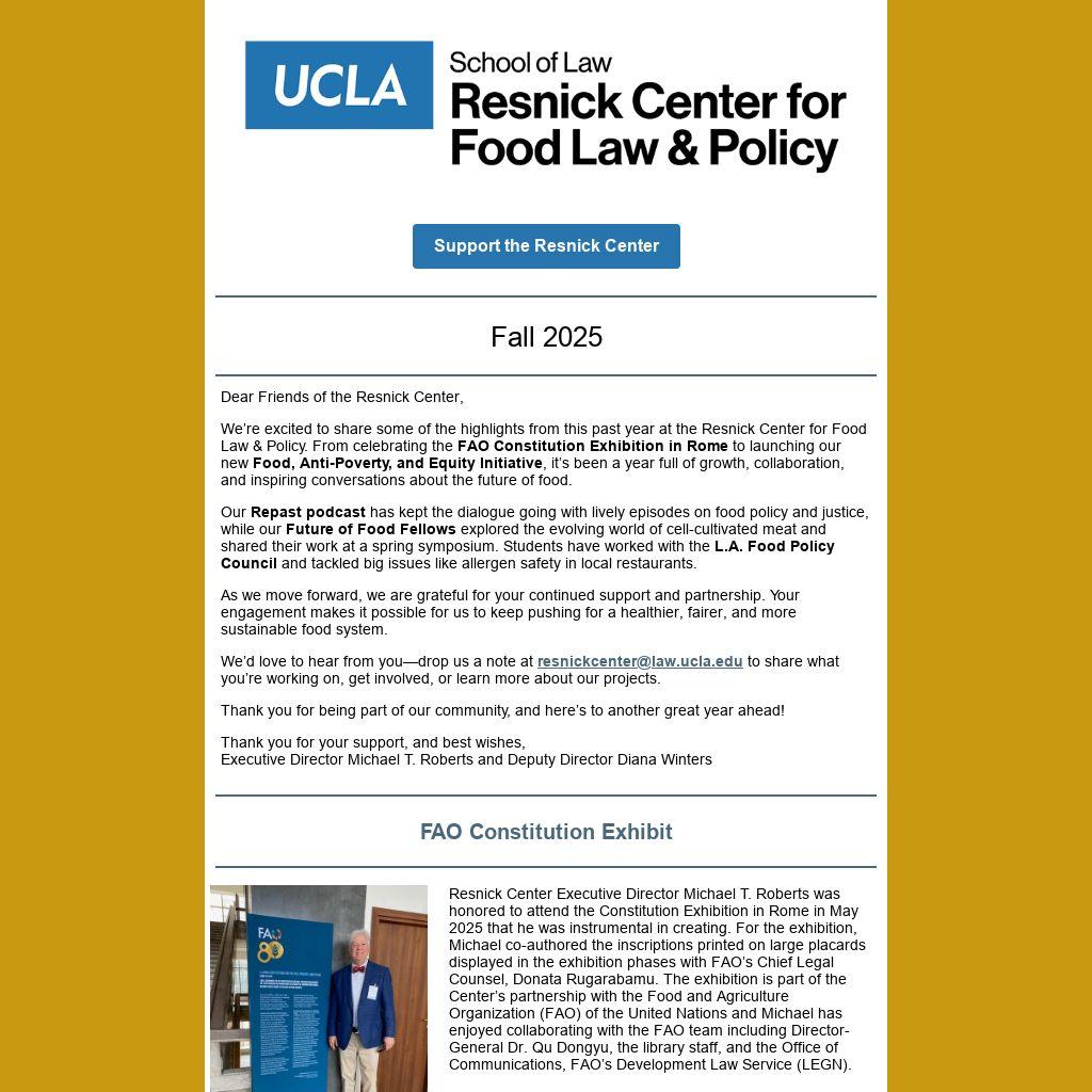 We’re excited to share some of the highlights from this past year at the Resnick Center for Food Law & Policy. From celebrating the FAO Constitution Exhibition in Rome to launching our new Food, Anti-Poverty, and Equity Initiative, it’s been a year full of growth, collaboration, and inspiring conversations about the future of food.