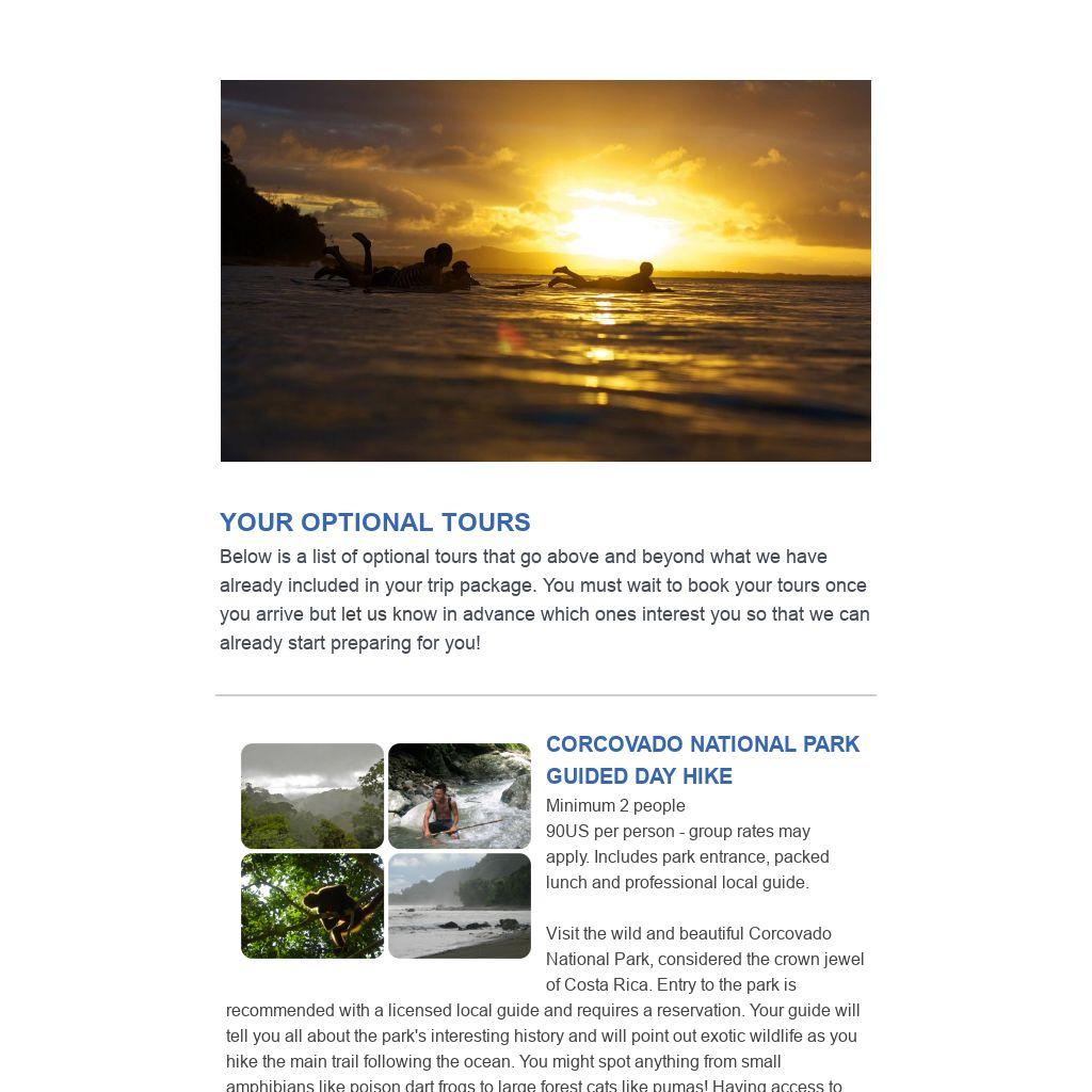 All tours can be arranged once on-site. There is no commitment needed in advance except for the three-day tour into Corcovado National Park. Payment for the tours is done at the beginning of your stay in USD cash so please bring sufficient funds. Once you book your spot (you'll be asked to sign up officially), tours are non-refundable unless cancelled by the provider. Note that the price is subject to change and that some tours may not be available if we do not have the minimum number of people required. That being said, in most cases, we can organize any tour only that the price of the tour may change.
