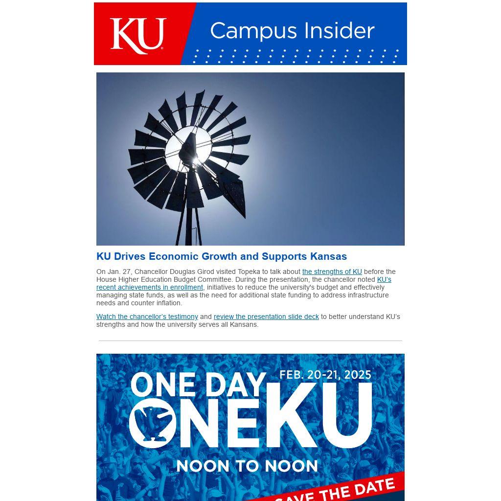 Mark your calendar for two days. One Day One KU will run from noon to noon Thursday, Feb. 20 to Friday, Feb. 21.
