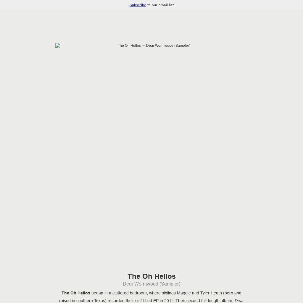 The Oh Hellos began in a cluttered bedroom, where siblings Maggie and Tyler Heath (born and raised in southern Texas) recorded their self-titled EP in 2011. Their second full-length album, Dear Wormwood, is a collection of songs inspired in part by C.S. Lewis's The Screwtape Letters, Patrick Rothfuss's The Name of the Wind, mythology and folklore and apocalyptic literature. The album tells the story of a protagonist trapped in an abusive relationship, by way of letters written to the antagonist. It was recorded, piece by piece, in the house where Maggie and Tyler live in San Marcos, TX, and much like The Oh Hellos' live performance, the album presents two alternating faces: at times delicate, intimate, and affectionate; at others soaring and towering and joyfully explosive. Download this sampler of select tracks from Dear Wormwood now!