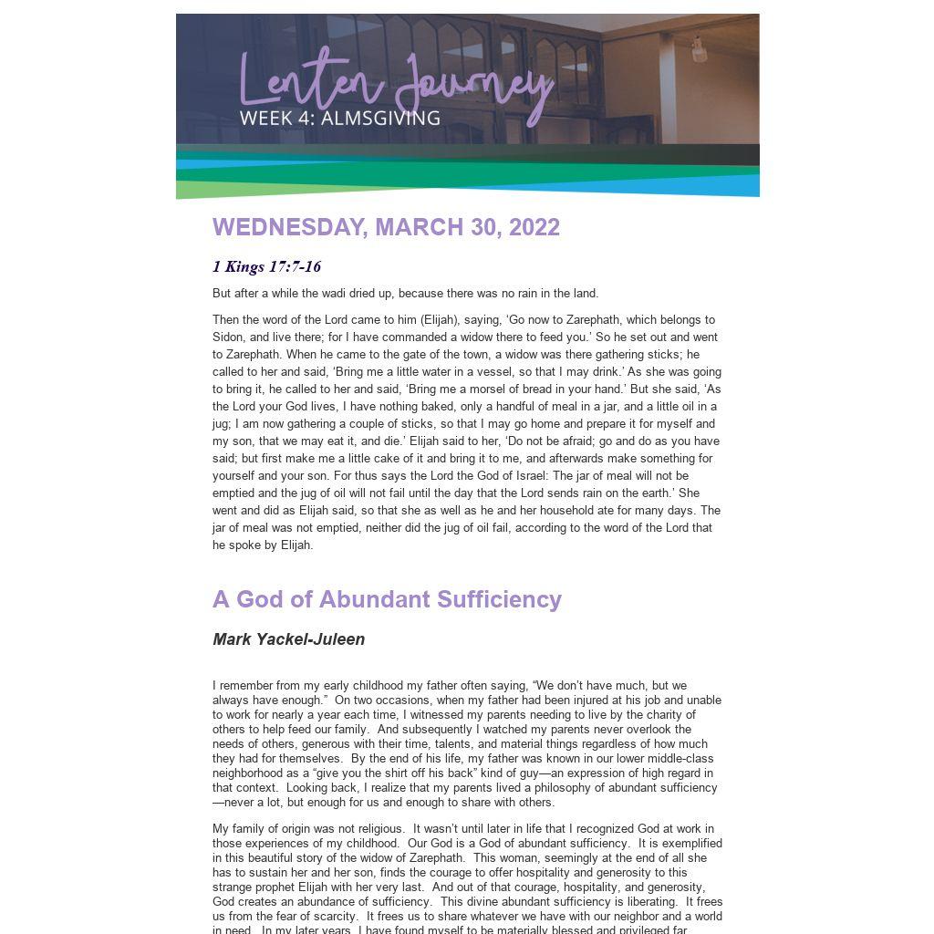 My family of origin was not religious. It wasn’t until later in life that I recognized God at work in those experiences of my childhood. Our God is a God of abundant sufficiency. It is exemplified in this beautiful story of the widow of Zarephath. This woman, seemingly at the end of all she has to sustain her and her son, finds the courage to offer hospitality and generosity to this strange prophet Elijah with her very last. And out of that courage, hospitality, and generosity, God creates an abundance of sufficiency. This divine abundant sufficiency is liberating. It frees us from the fear of scarcity. It frees us to share whatever we have with our neighbor and a world in need. In my later years, I have found myself to be materially blessed and privileged far beyond what my parents ever experienced. But in that, I have sought, however imperfectly, to live out of God’s abundant sufficiency—to gratefully accept what is enough and to share the rest.