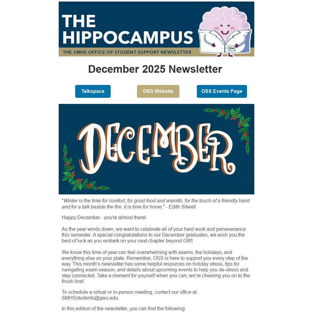 We know this time of year can feel overwhelming with exams, the holidays, and everything else on your plate. Remember, OSS is here to support you every step of the way. This month’s newsletter has some helpful resources on holiday stress, tips for navigating exam season, and details about upcoming events to help you de-stress and stay connected. Take a moment for yourself when you can; we’re cheering you on to the finish line!