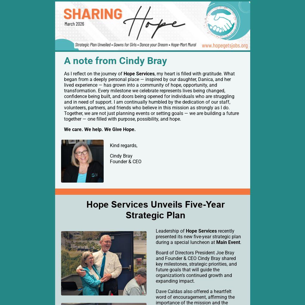 As I reflect on the journey of Hope Services, my heart is filled with gratitude. What began from a deeply personal place — inspired by our daughter, Danica, and her lived experience — has grown into a community of hope, opportunity, and transformation. Every milestone we celebrate represents lives being changed, confidence being built, and doors being opened for individuals who are struggling and in need of support. I am continually humbled by the dedication of our staff, volunteers, partners, and friends who believe in this mission as strongly as I do. Together, we are not just planning events or setting goals — we are building a future together — one filled with purpose, possibility, and hope.