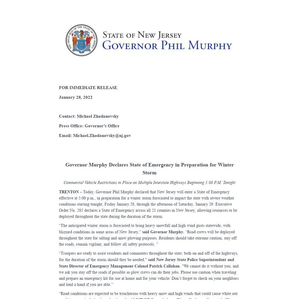 TRENTON – Today, Governor Phil Murphy declared that New Jersey will enter a State of Emergency effective at 5:00 p.m., in preparation for a winter storm forecasted to impact the state with severe weather conditions starting tonight, Friday January 28, through the afternoon of Saturday, January 29. Executive Order No. 285 declares a State of Emergency across all 21 counties in New Jersey, allowing resources to be deployed throughout the state during the duration of the storm.