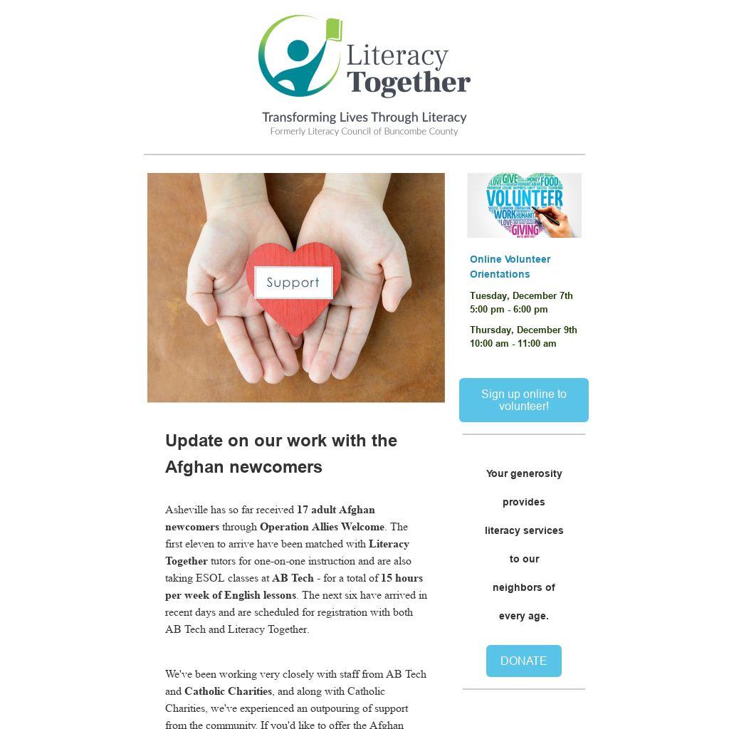 Thank you to United Way of Asheville and Buncombe County for featuring Literacy Together in its November newsletter! United Way of Asheville and Buncombe County is celebrating 100 years of community service and they have a message to share: "We invite you to join us as we all work to create a UNITED and resilient community where everyone belongs and everyone thrives."
