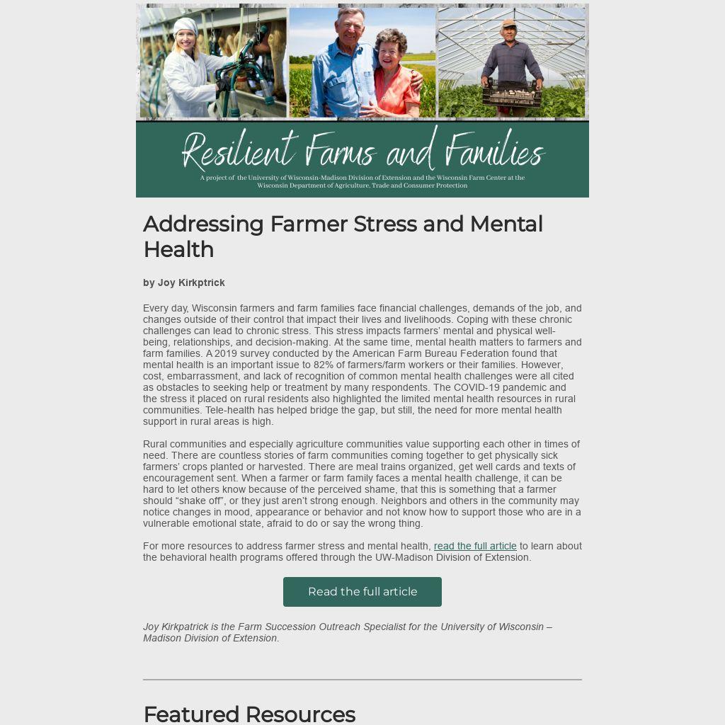 For more resources to address farmer stress and mental health, read the full article to learn about the behavioral health programs offered through the UW-Madison Division of Extension.
