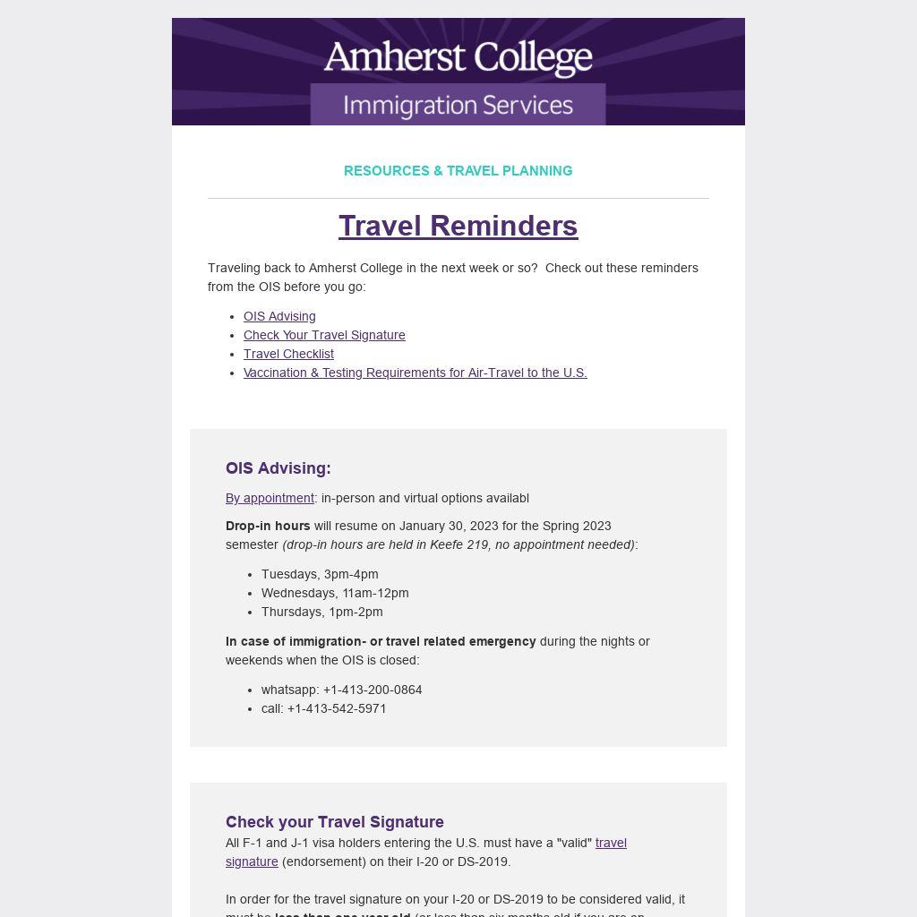 Traveling back to Amherst College in the next week or so?  Check out these reminders from the OIS before you go: