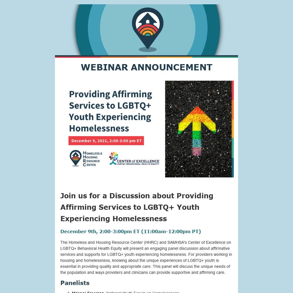 The Homeless and Housing Resource Center (HHRC) and SAMHSA's Center of Excellence on LGBTQ+ Behavioral Health Equity will present an engaging panel discussion about affirmative services and supports for LGBTQ+ youth experiencing homelessness. For providers working in housing and homelessness, knowing about the unique experiences of LGBTQ+ youth is essential in providing quality and appropriate care. This panel will discuss the unique needs of the population and ways providers and clinicians can provide supportive and affirming care.