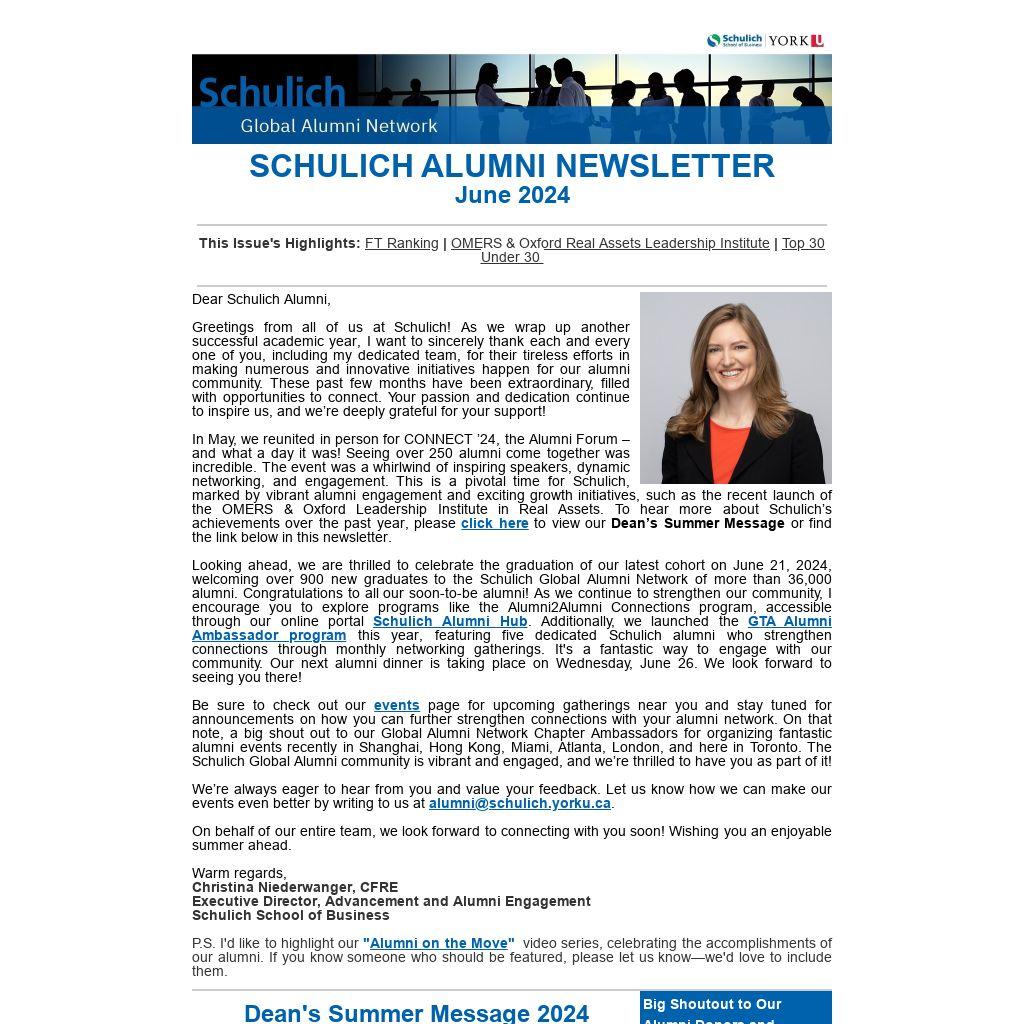 Looking ahead, we are thrilled to celebrate the graduation of our latest cohort on June 21, 2024, welcoming over 900 new graduates to the Schulich Global Alumni Network of more than 36,000 alumni. Congratulations to all our soon-to-be alumni! As we continue to strengthen our community, I encourage you to explore programs like the Alumni2Alumni Connections program, accessible through our online portal Schulich Alumni Hub. Additionally, we launched the GTA Alumni Ambassador program this year, featuring five dedicated Schulich alumni who strengthen connections through monthly networking gatherings. It's a fantastic way to engage with our community. Our next alumni dinner is taking place on Wednesday, June 26. We look forward to seeing you there!