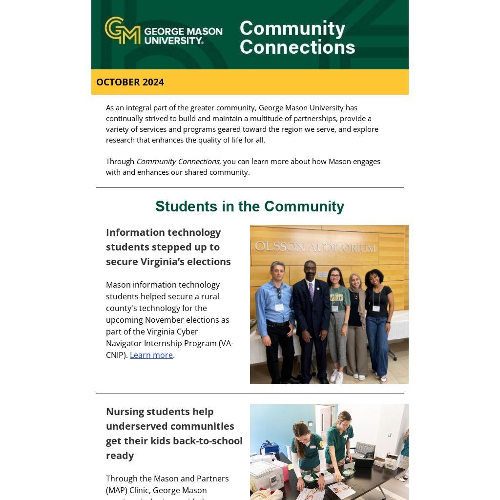 Through Community Connections, you can learn more about how Mason engages with and enhances our shared community.