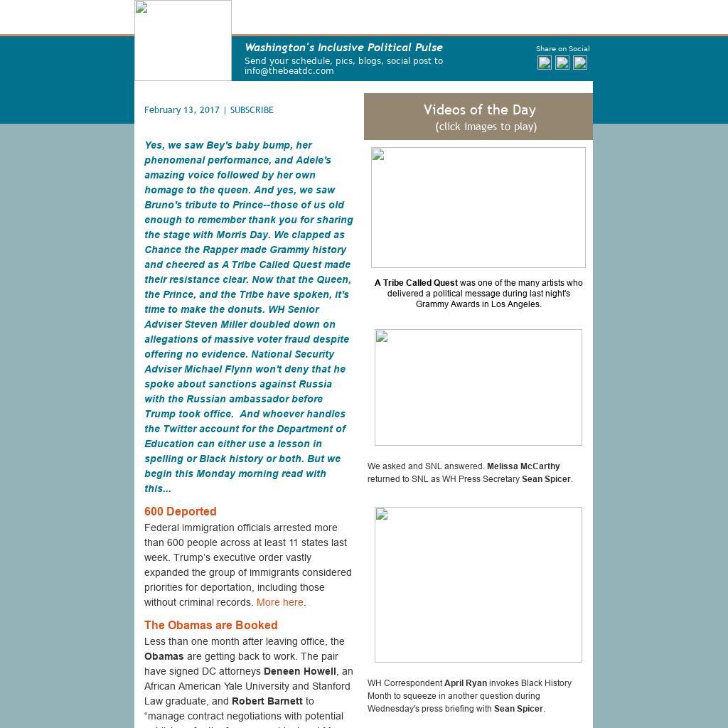Yes, we saw Bey's baby bump, her phenomenal performance, and Adele's amazing voice followed by her own homage to the queen. And yes, we saw Bruno's tribute to Prince--those of us old enough to remember thank you for sharing the stage with Morris Day. We clapped as Chance the Rapper made Grammy history and cheered as A Tribe Called Quest made their resistance clear. Now that the Queen, the Prince, and the Tribe have spoken, it's time to make the donuts. WH Senior Adviser Steven Miller doubled down on allegations of massive voter fraud despite offering no evidence. National Security Adviser Michael Flynn won't deny that he spoke about sanctions against Russia with the Russian ambassador before Trump took office. And whoever handles the Twitter account for the Department of Education can either use a lesson in spelling or Black history or both. But we begin this Monday morning read with this...