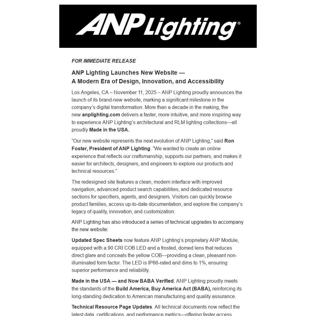 Los Angeles, CA – November 11, 2025 – ANP Lighting proudly announces the launch of its brand-new website, marking a significant milestone in the company’s digital transformation. More than a decade in the making, the new anplighting.com delivers a faster, more intuitive, and more inspiring way to experience ANP Lighting’s architectural and RLM lighting collections—all proudly Made in the USA.