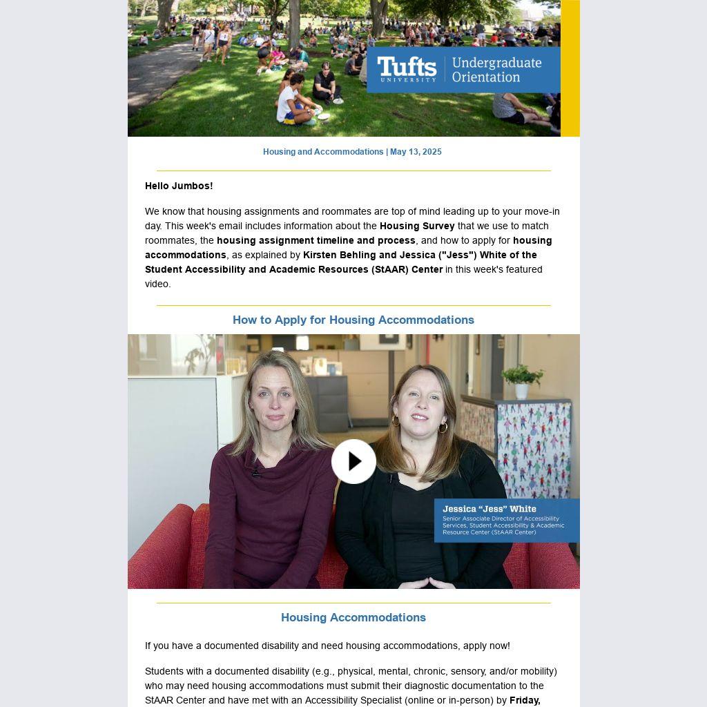 We know that housing assignments and roommates are top of mind leading up to your move-in day. This week's email includes information about the Housing Survey that we use to match roommates, the housing assignment timeline and process, and how to apply for housing accommodations, as explained by Kirsten Behling and Jessica ("Jess") White of the Student Accessibility and Academic Resources (StAAR) Center in this week's featured video.