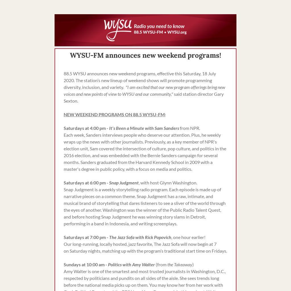 NEW WEEKEND PROGRAMS ON 88.5 WYSU-FM: