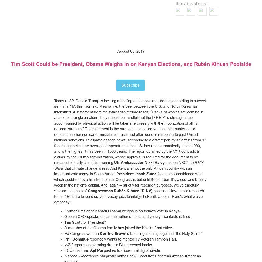 Today at 3P, Donald Trump is hosting a briefing on the opioid epidemic, according to a tweet sent at 7:11A this morning. Meanwhile, the beef between the U.S. and North Korea has intensified. A statement from the totalitarian regime reads, “Packs of wolves are coming in attack to strangle a nation. They should be mindful that the D.P.R.K.’s strategic steps accompanied by physical action will be taken mercilessly with the mobilization of all its national strength.” The statement is the strongest indication yet that the country could conduct another nuclear or missile test, as it had often done in response to past United Nations sanctions. In climate change news, according to a draft report by scientists from 13 federal agencies, the average temperature in the U.S. has risen dramatically since 1980, and is the highest it has been in 1500 years. The report obtained by the NYT contradicts claims by the Trump administration, whose approval is required for the document to be released officially. Just this morning UN Ambassador Nikki Haley said on NBC’s TODAY Show that climate change is real. And Kenya is not the only African country with an important vote today. In South Africa, President Jacob Zuma faces a no-confidence vote which could remove him from office. Congress is out until September. It’s a cool and breezy week in the nation’s capital. And, again -- strictly for research purposes, we’ve carefully studied the photo of Congressman Rubén Kihuen (D-NV) poolside. Have more research for us? Be sure to send us your vacay pics to info@TheBeatDC.com. Here's what we've got today: