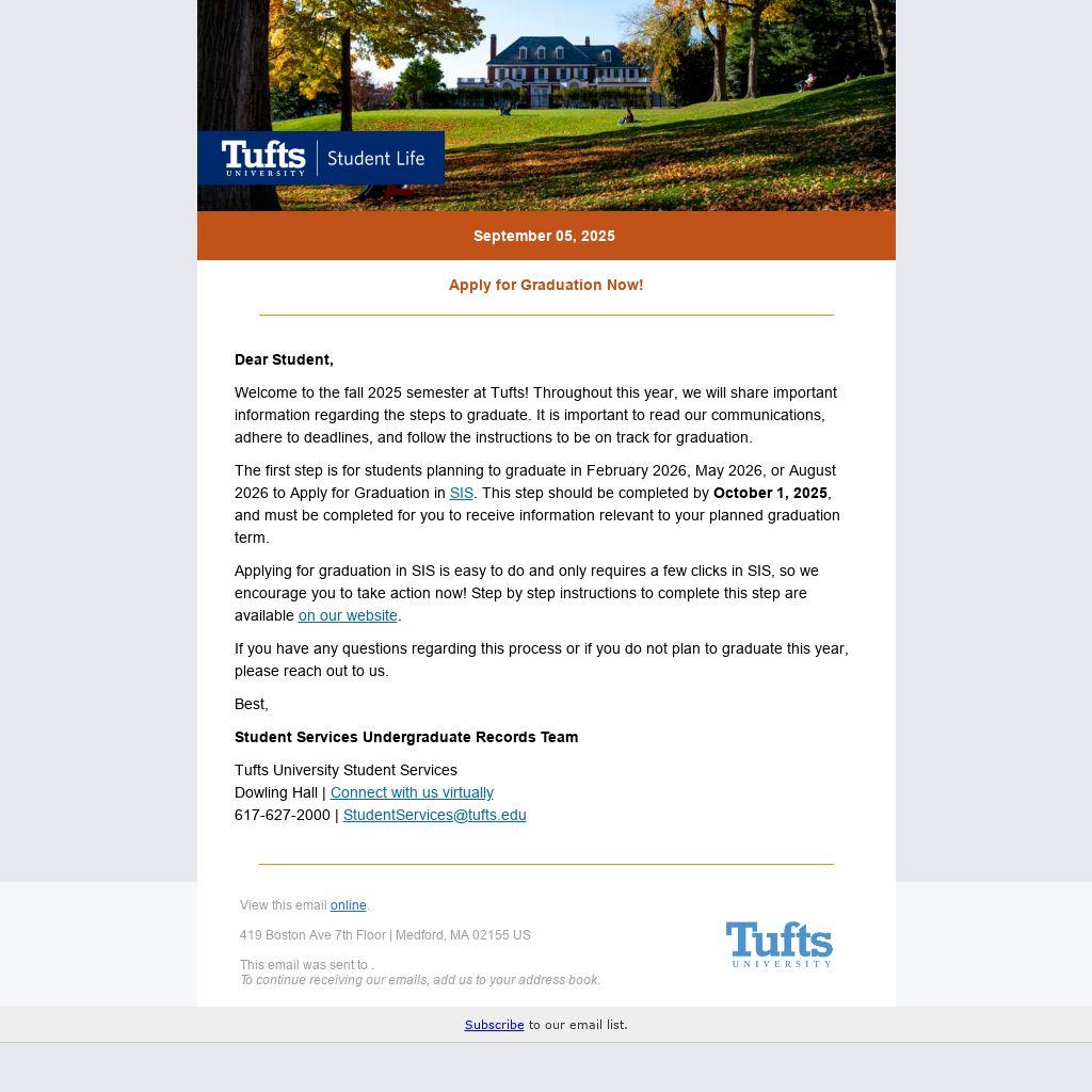 Welcome to the fall 2025 semester at Tufts! Throughout this year, we will share important information regarding the steps to graduate. It is important to read our communications, adhere to deadlines, and follow the instructions to be on track for graduation.
