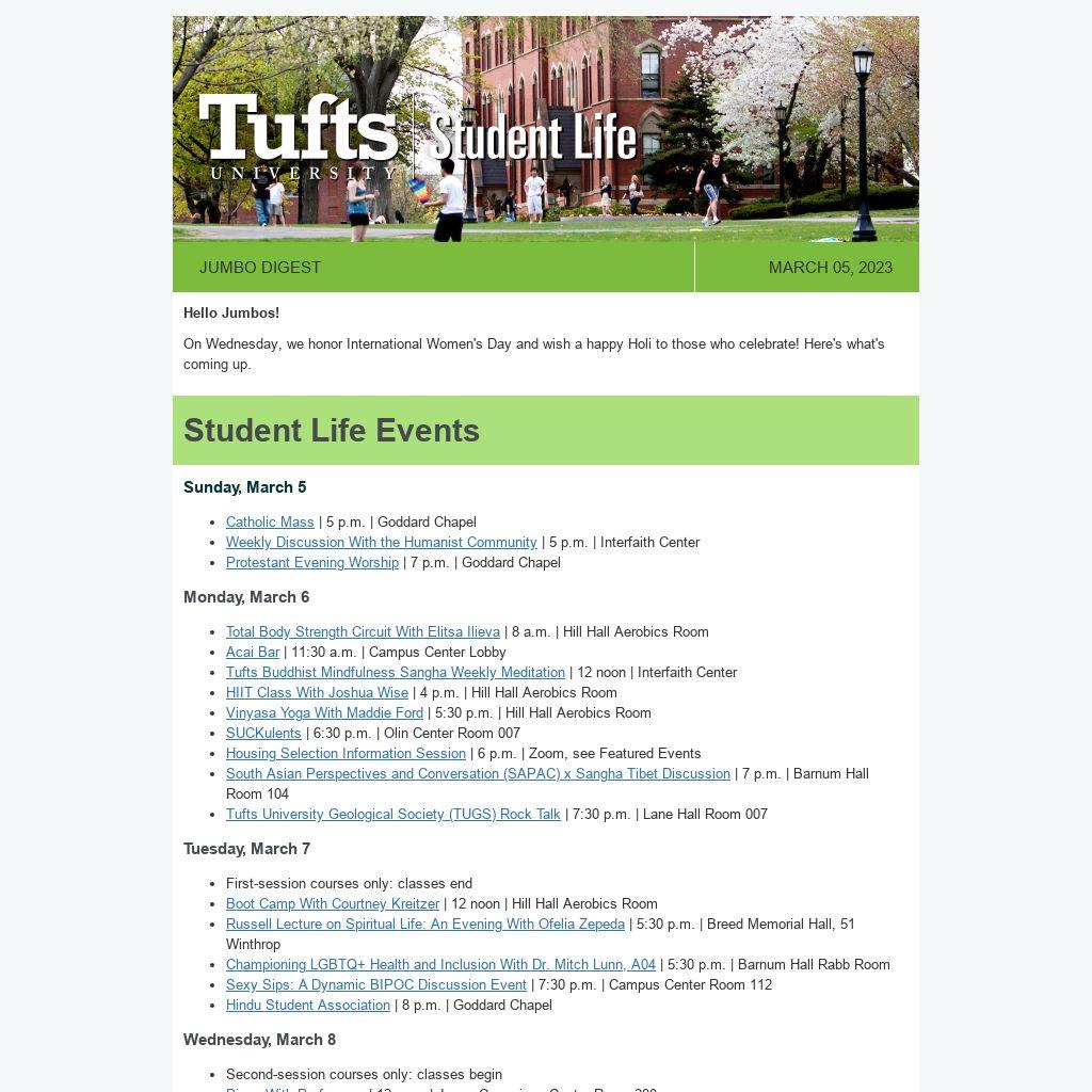 Students and Student Organizations can submit events to JumboLife! Add your event by Thursday at 12 noon each week, and we'll include it in the Jumbo Digest on Sunday.