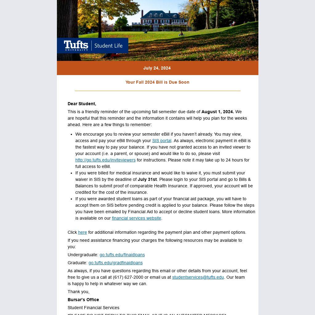 As always, if you have questions regarding this email or other details from your account, feel free to give us a call at (617) 627-2000 or email us at studentservices@tufts.edu. Our team is happy to help in whatever way we can.