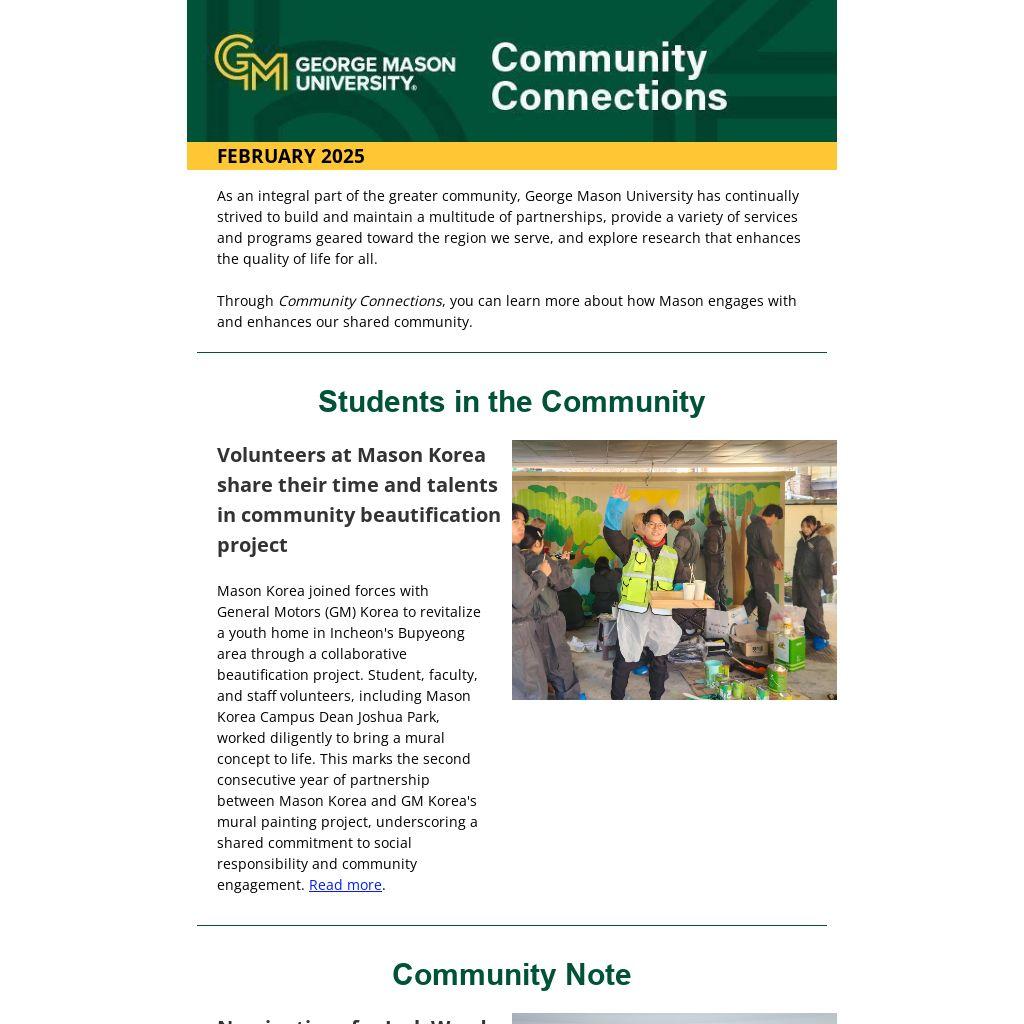 Through Community Connections, you can learn more about how Mason engages with and enhances our shared community.