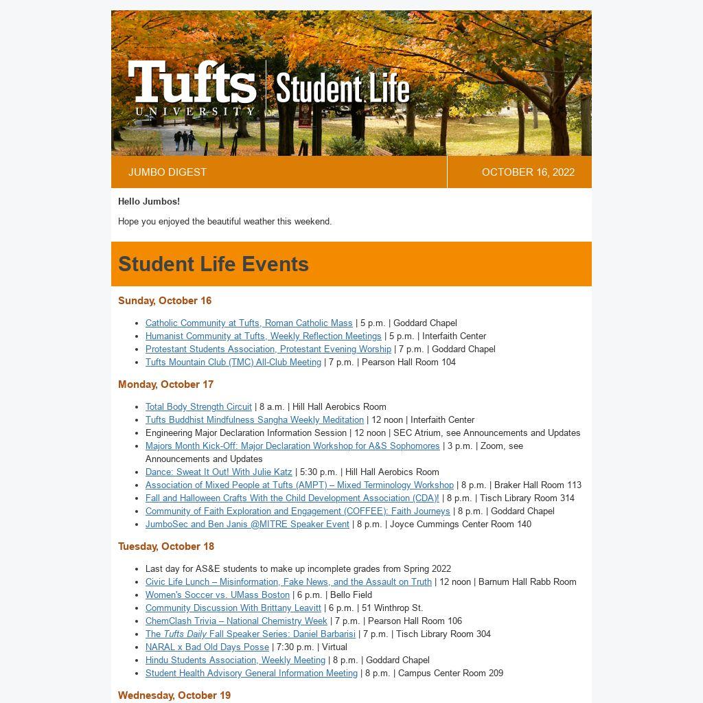 Students and Student Organizations can submit events to JumboLife by Thursdays at 12 noon and we'll include them in the Jumbo Digest!