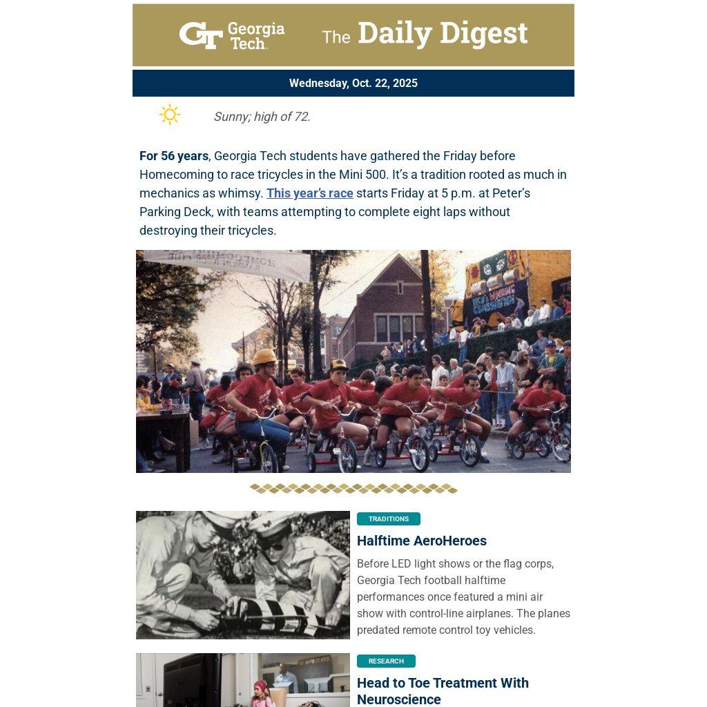 For 56 years, Georgia Tech students have gathered the Friday before Homecoming to race tricycles in the Mini 500. It’s a tradition rooted as much in mechanics as whimsy. This year’s race starts Friday at 5 p.m. at Peter’s Parking Deck, with teams attempting to complete eight laps without destroying their tricycles.